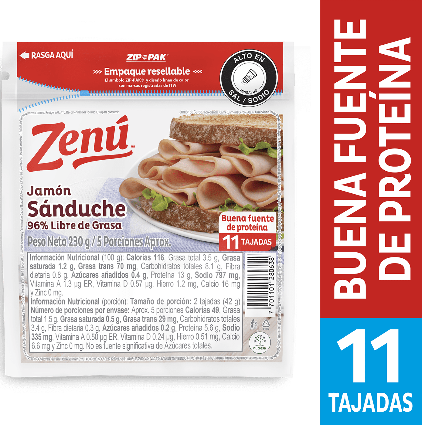 Jamón Zenú Sanduche 11 Tajadas x230g cantidad
